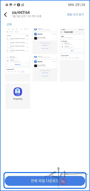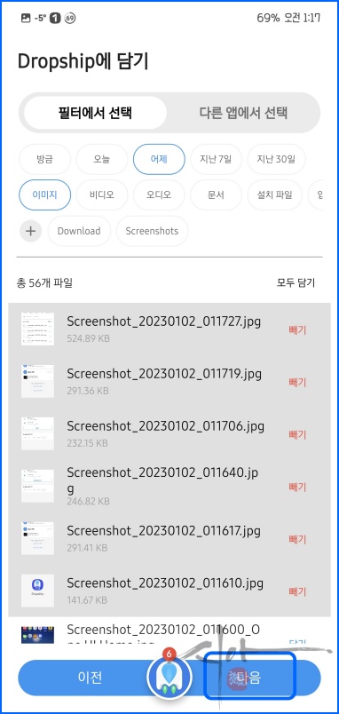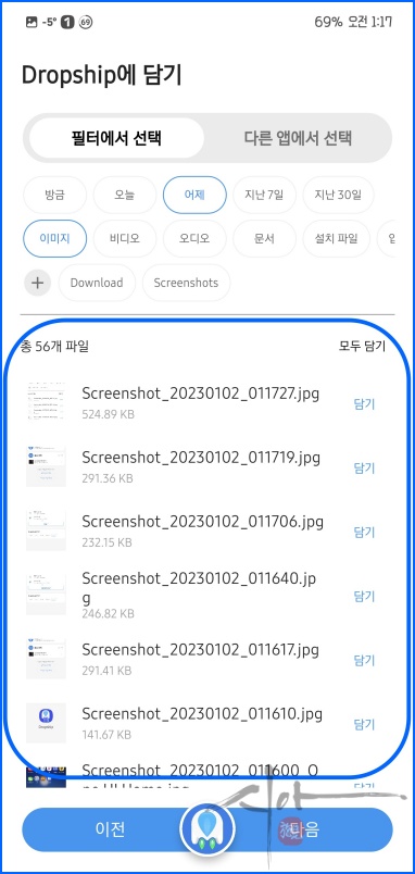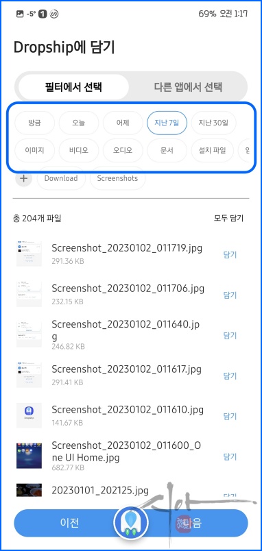 '담기'를 통해 공유할 파일을 선택하자