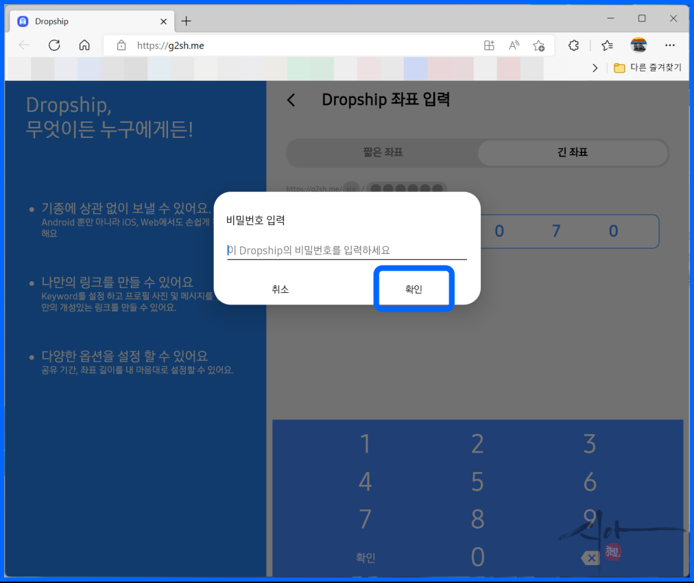 비밀번호를 입력 후 '확인' 클릭