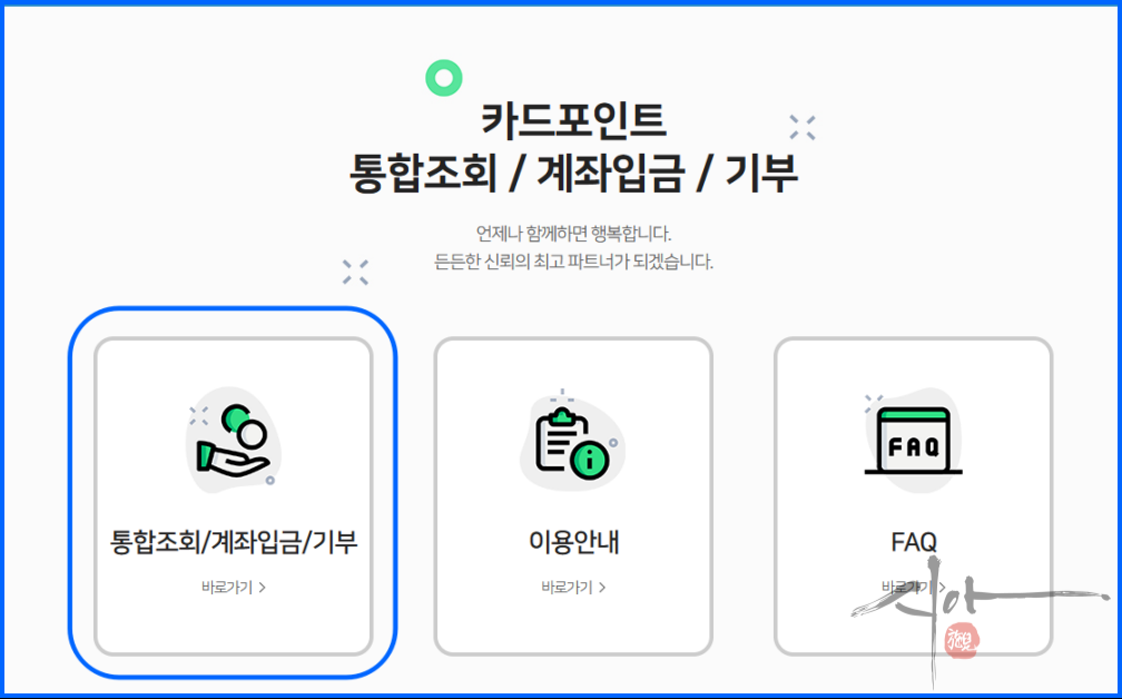 카드포인트통합조회 / 계좌입금 / 기부 언제나 함께하면 행복합니다. 든든한 신뢰의 최고 파트너가 되겠습니다.