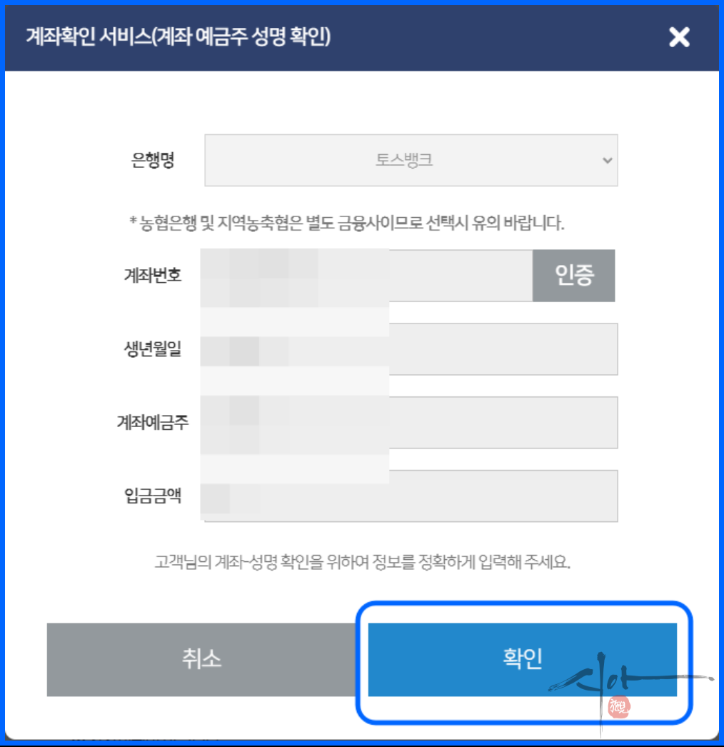 입금받을 은행, 계좌 작성 후