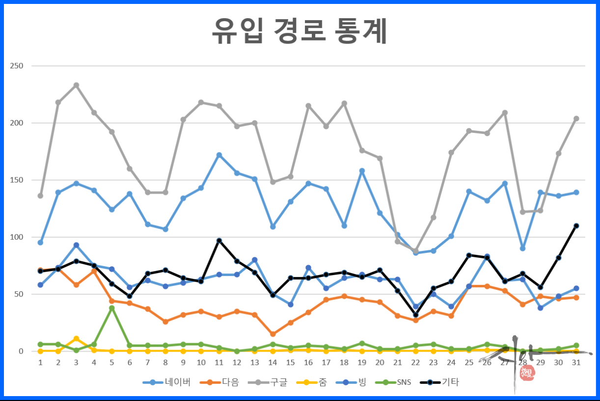 검색엔진 별 통계를 내보면 구글 유입이 이틀 빼고 꾸준히 1위를 기록 중이다