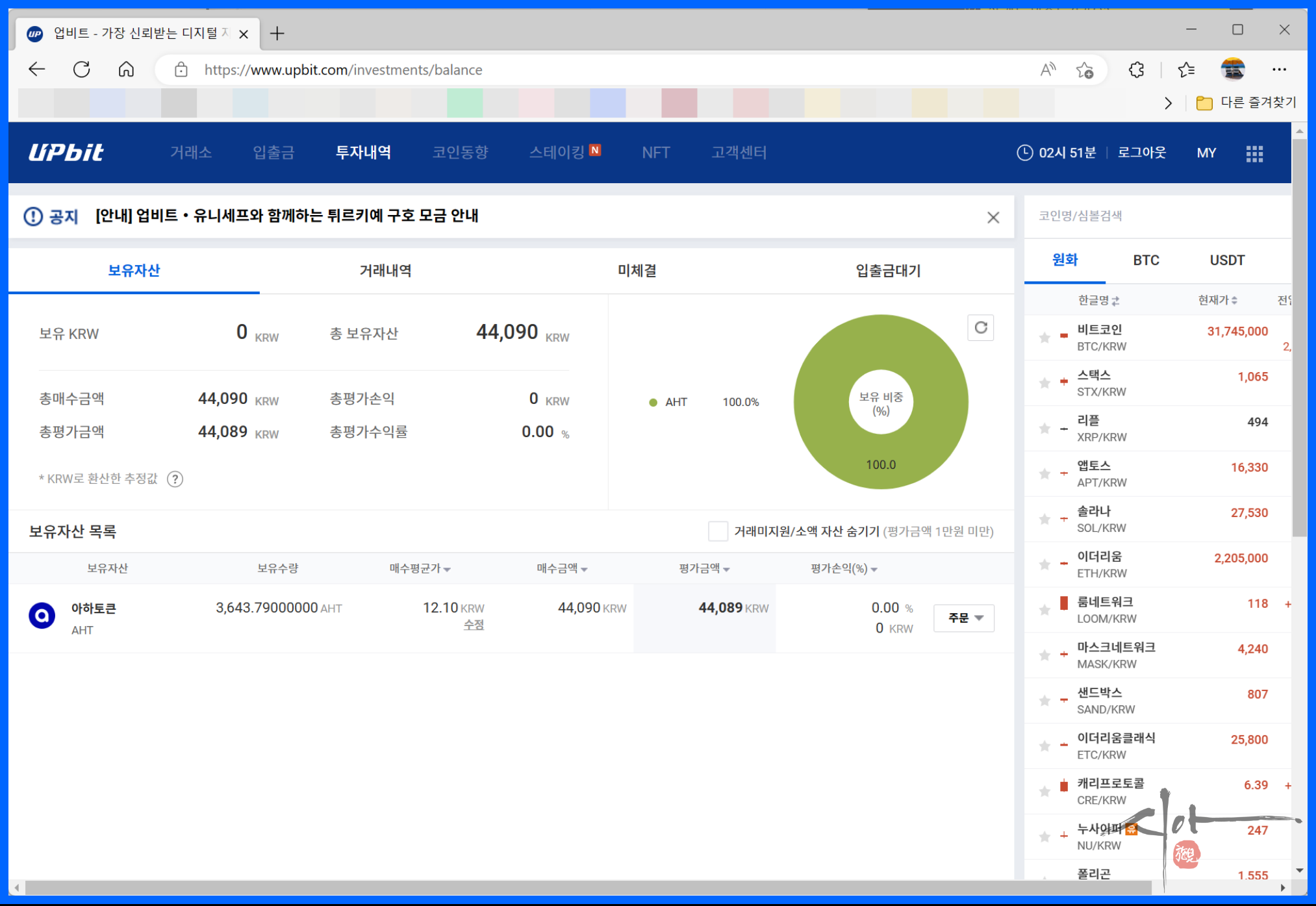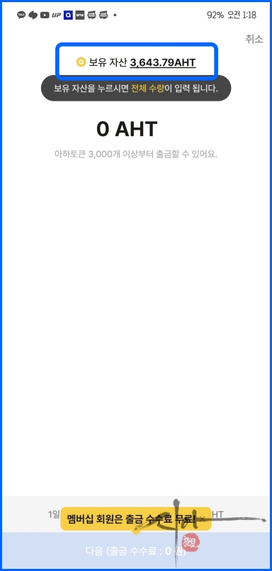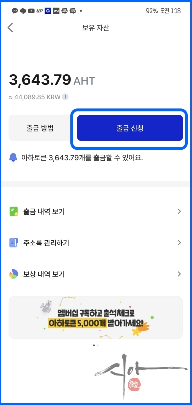투자내역을 보면 아하토큰이 들어온 걸 확인할 수 있다