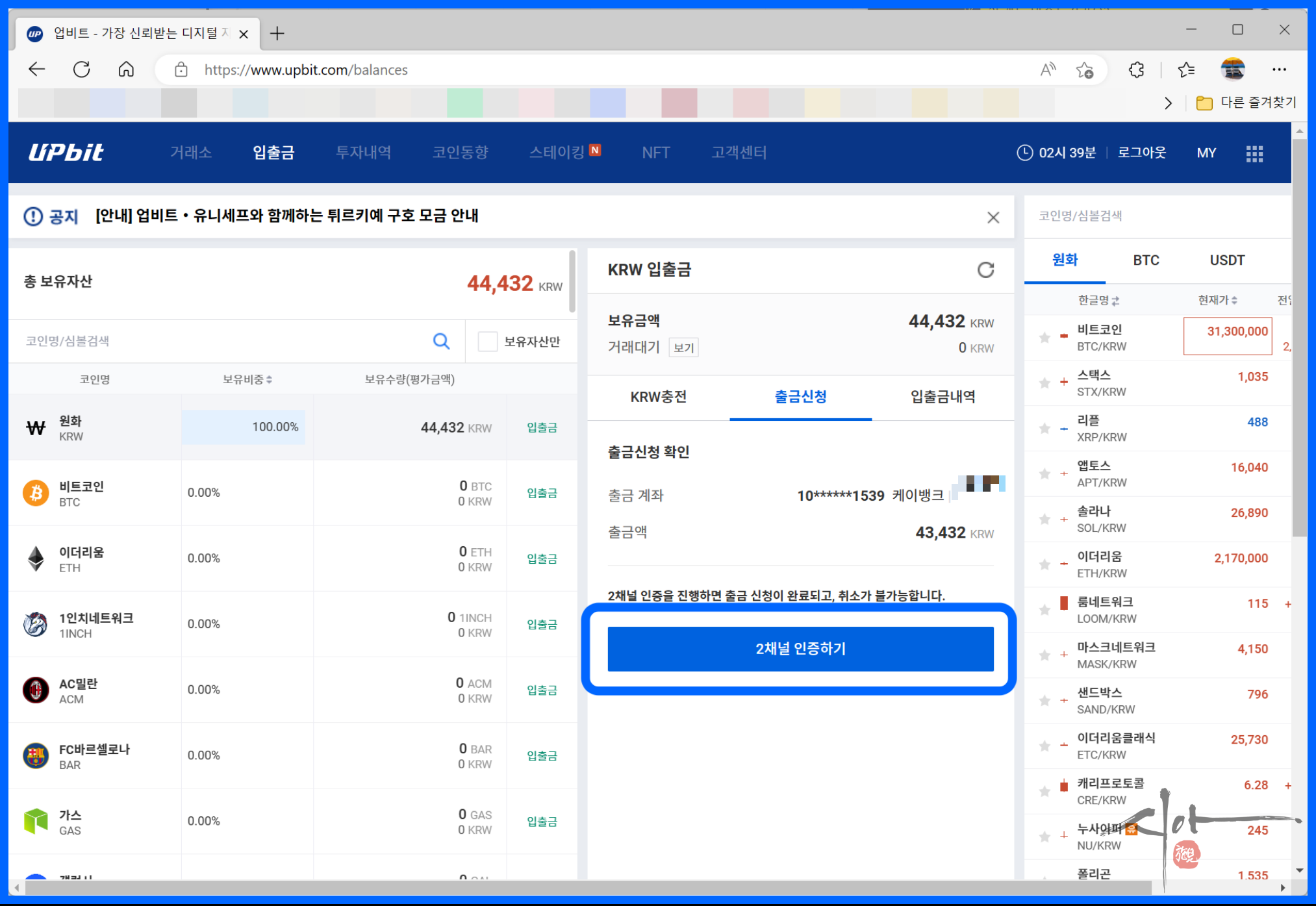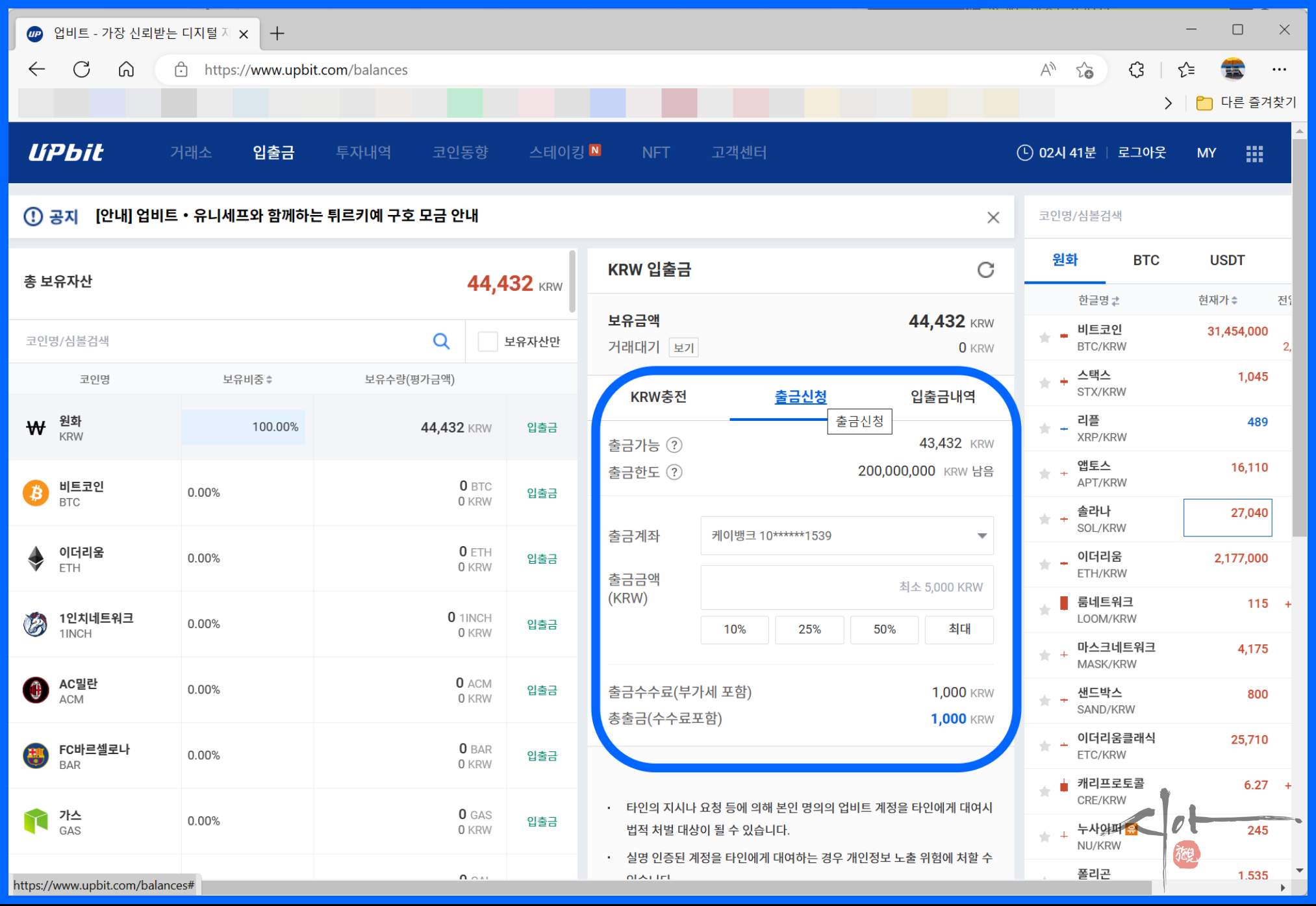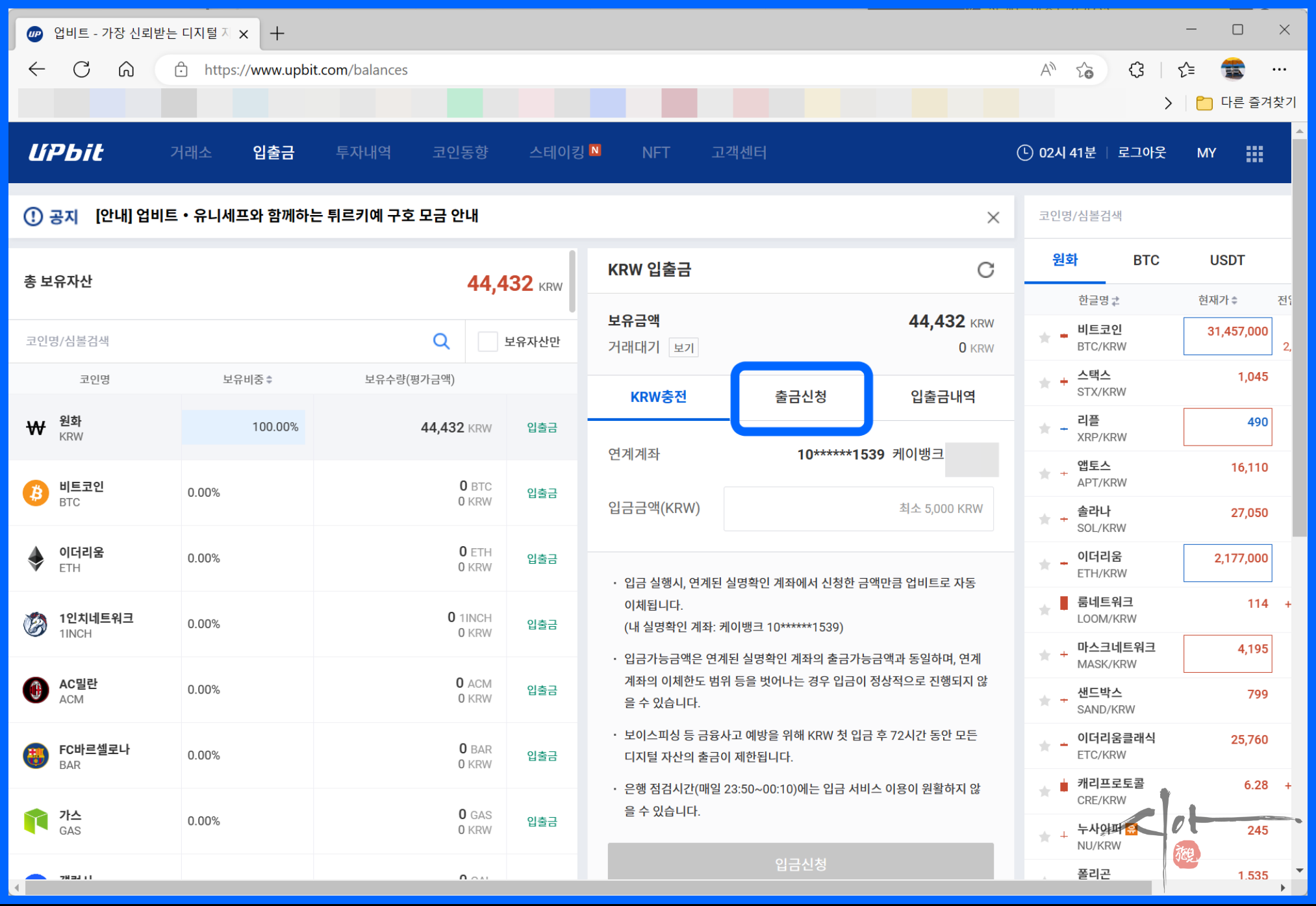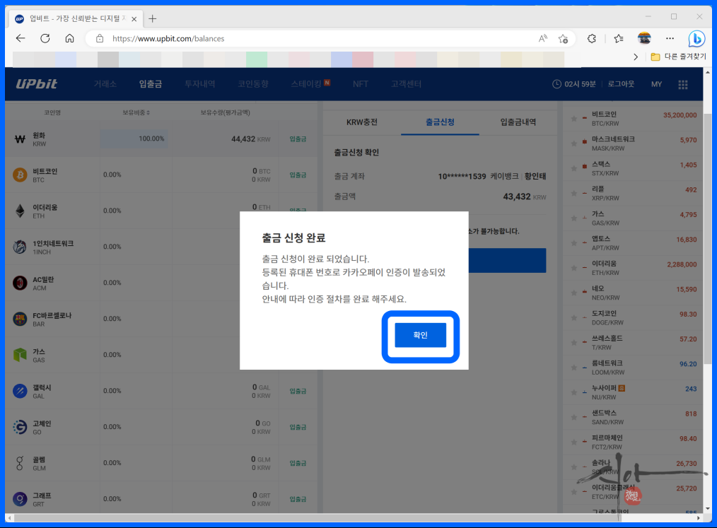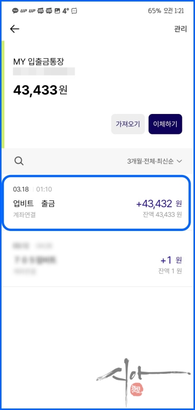 필자는 출금신청 1분 만에 업비트에 입금이 되었다