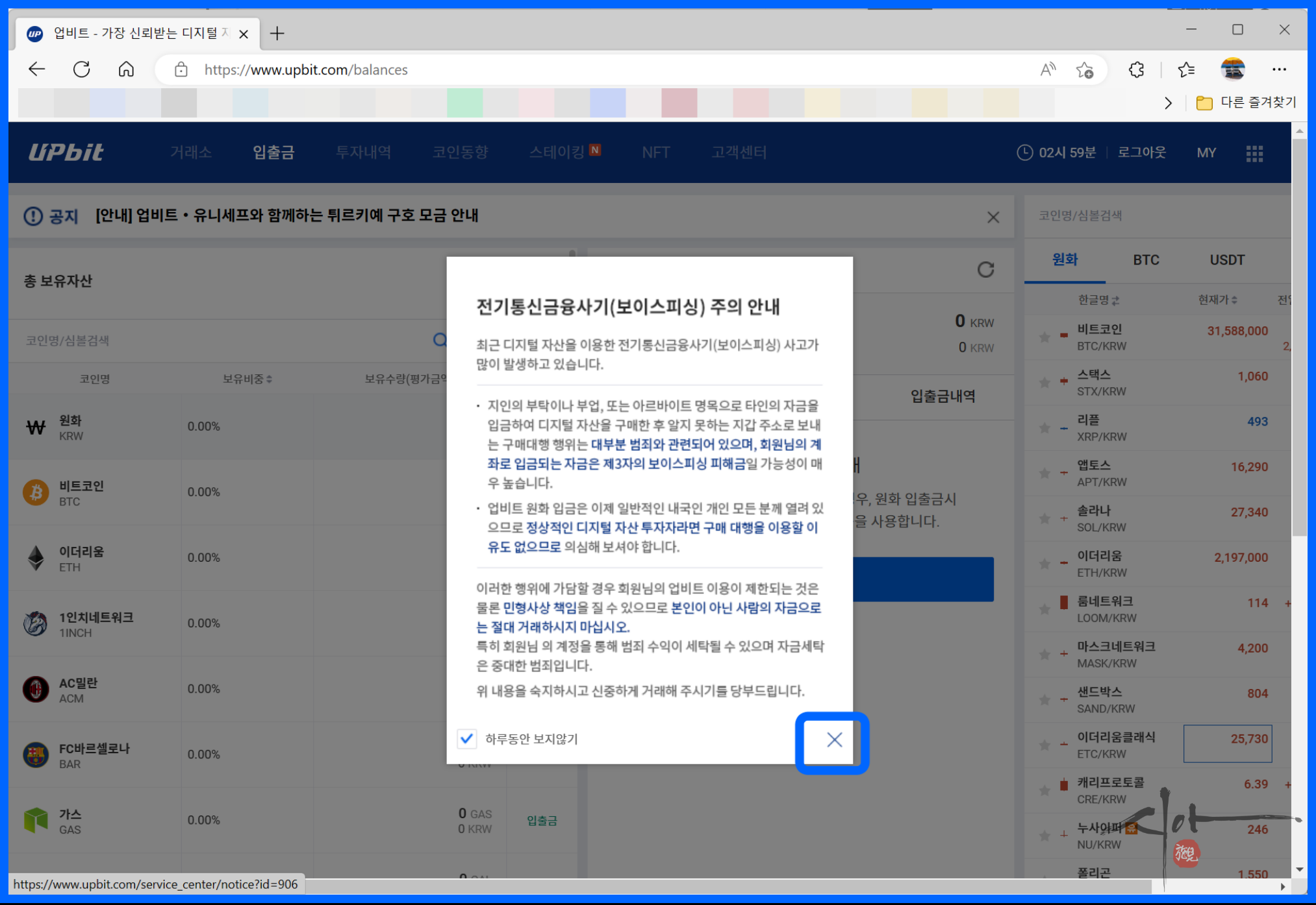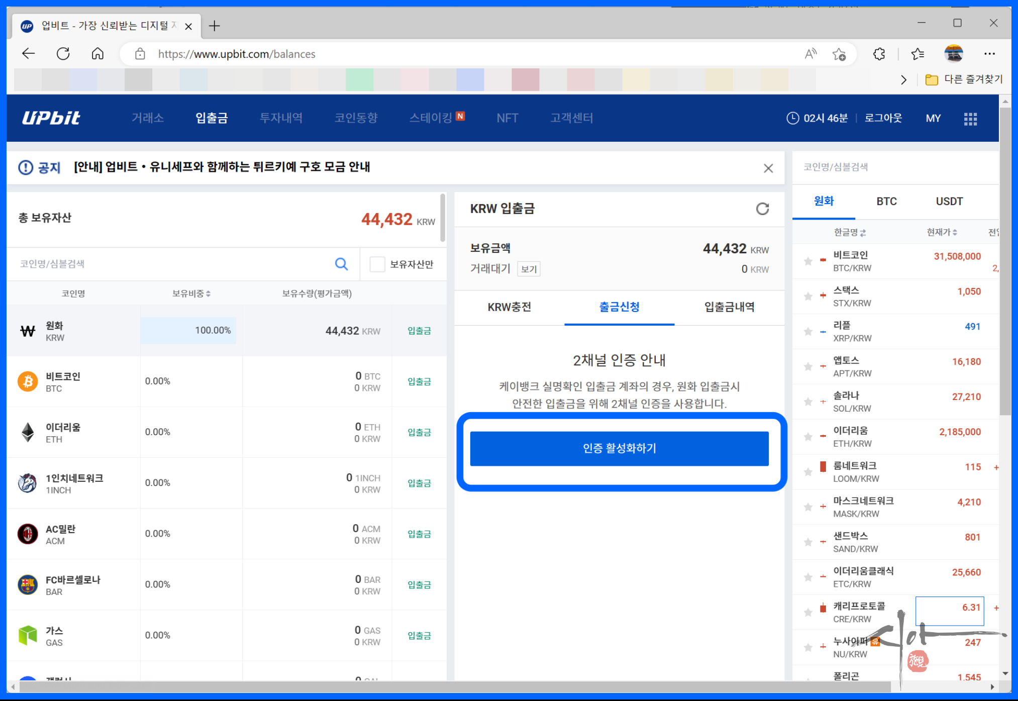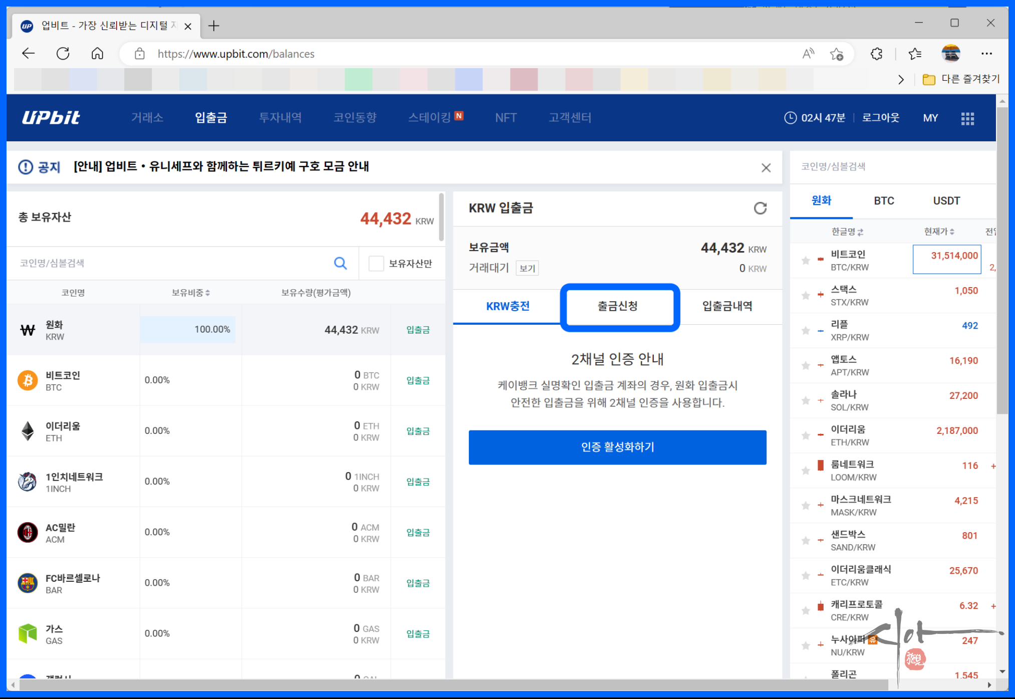 필자는 출금신청 1분 만에 업비트에 입금이 되었다