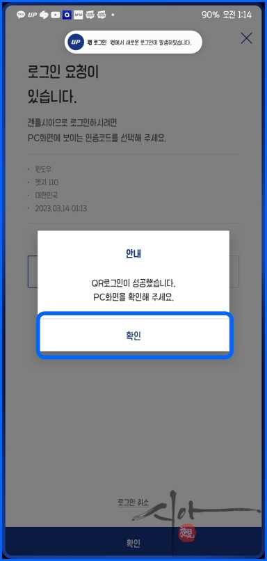 컴퓨터 화면에 뜬 QR코드를 인식시킨다