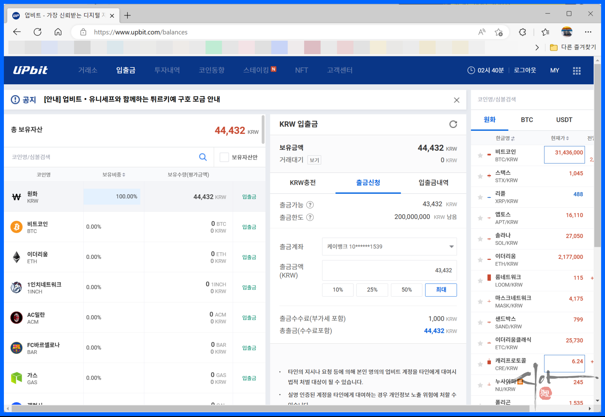 수수료가 빠진 43,432원 출금가능하다