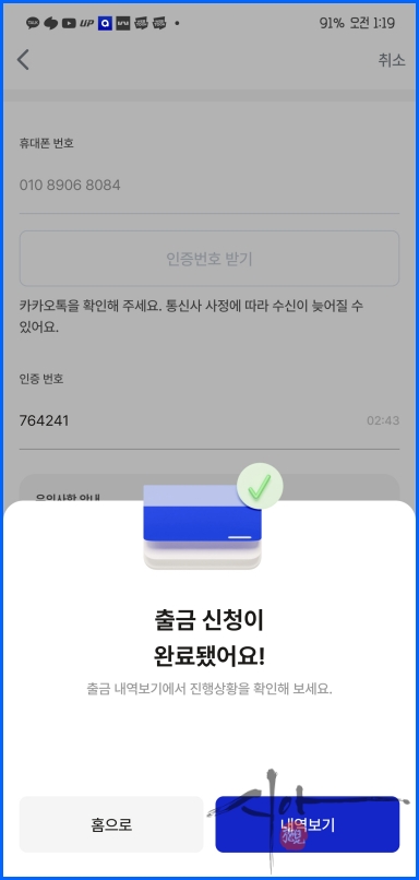출금 신청이 완료되었다
