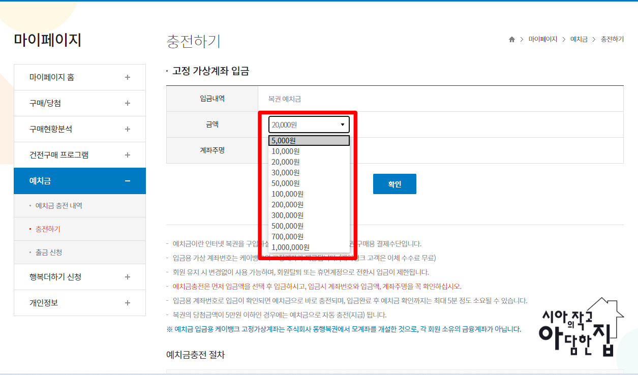 입금 금액 선택 후 확인 클릭