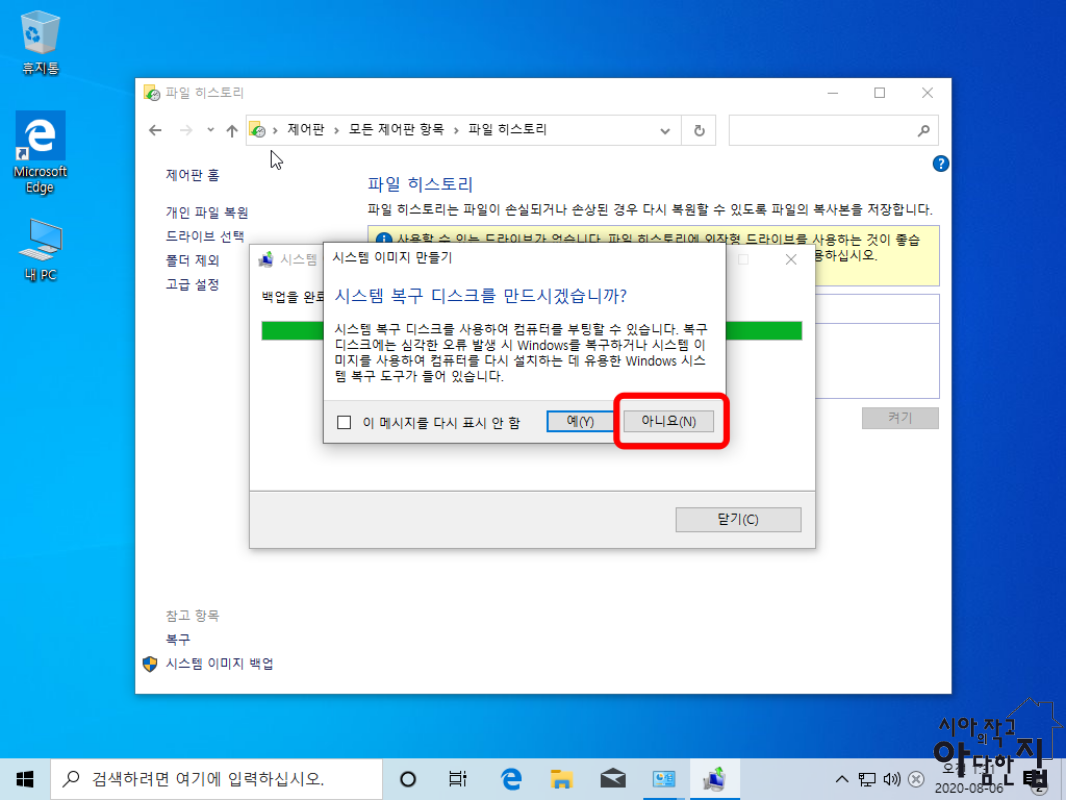 시스템 복귀 디스크를 만드시겠습니까를 묻는다