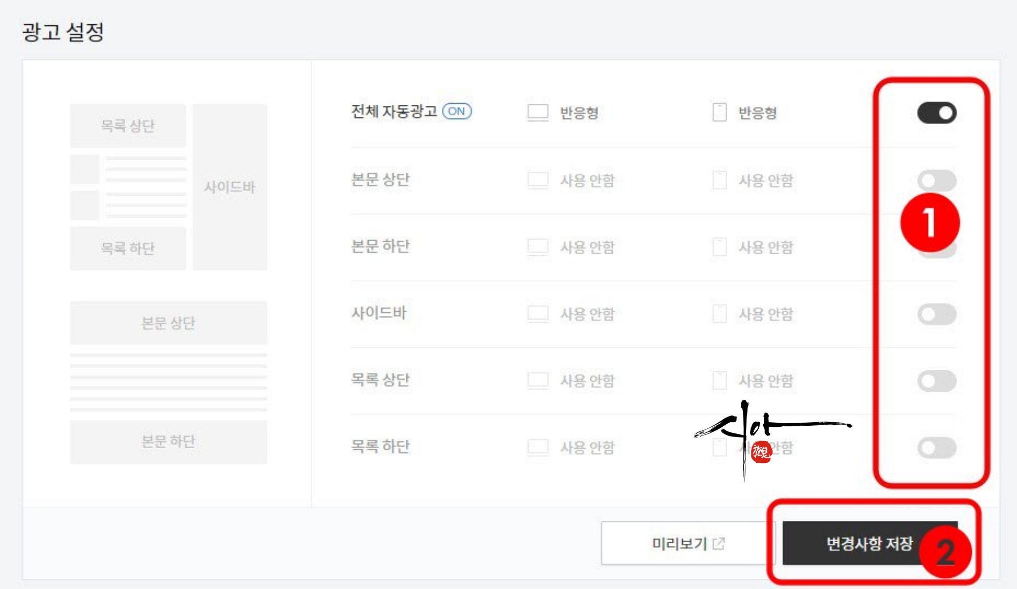 광고 설정을 하고 " 변경사항 저장 "