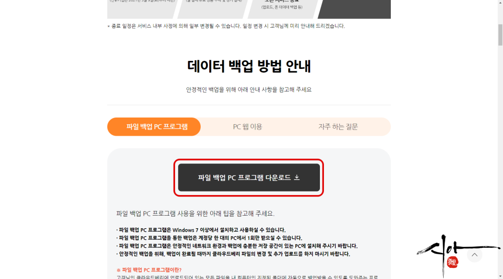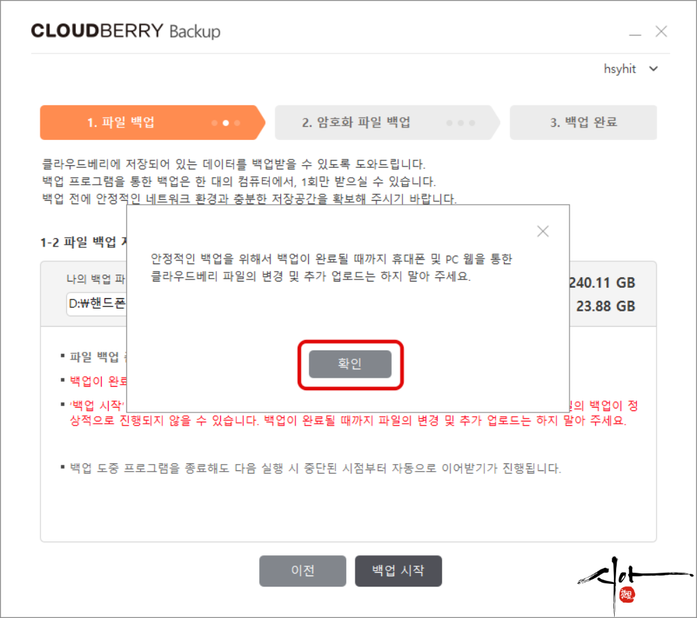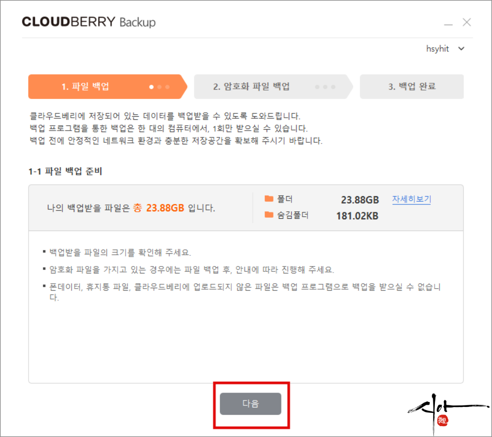 로그인을 하면 백업받을 파일의 총용량이 나온다