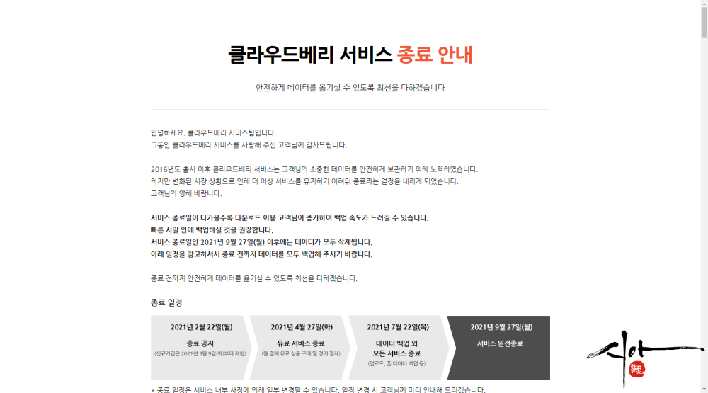 핸드폰 문자, 사진, 동영상 등등 데이터를 지켜주었던 클라우드베리 서비가 종료된다고 한다